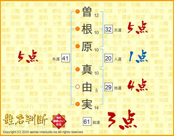 曽(12画)根(10画)原(10画) 真(10画)由(5画)実(14画)
