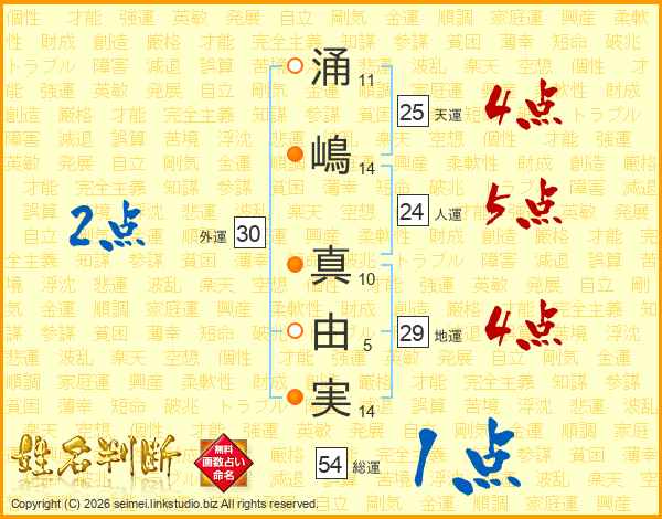 涌(11画)嶋(14画) 真(10画)由(5画)実(14画)