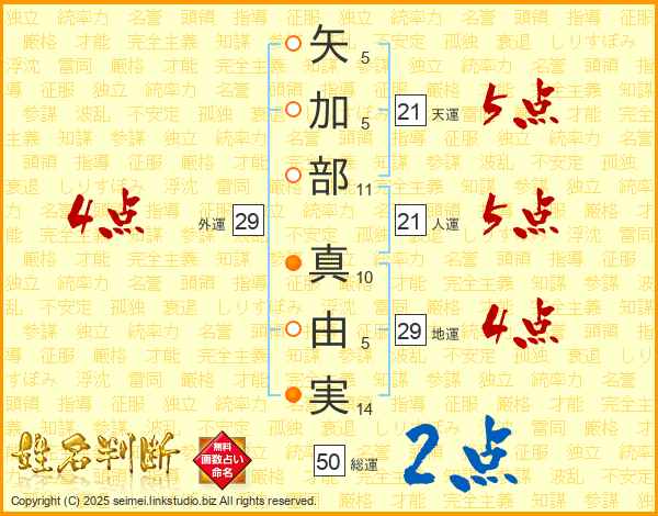 矢加部真由実さんの総運は50画の2点!