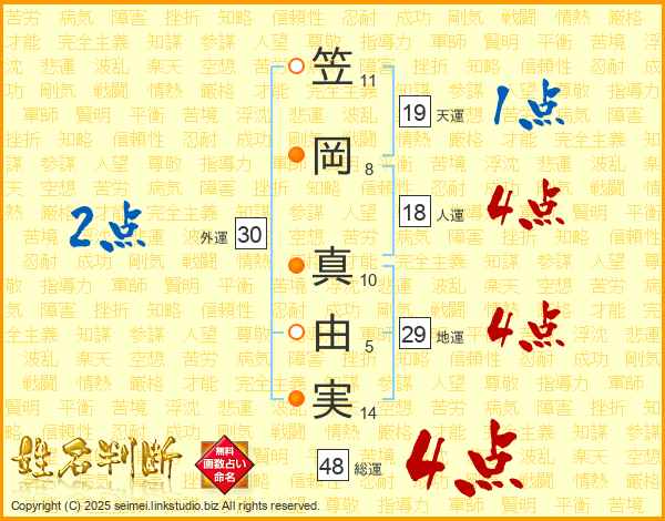 笠(11画)岡(8画) 真(10画)由(5画)実(14画)