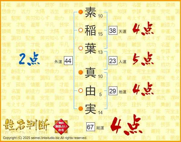 素(10画)稲(15画)葉(13画) 真(10画)由(5画)実(14画)