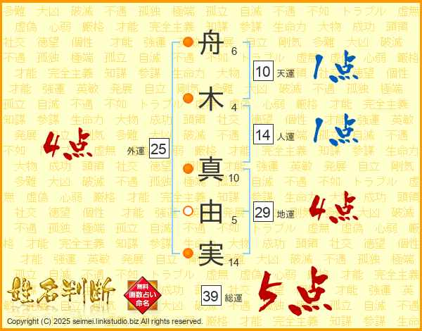 舟(6画)木(4画) 真(10画)由(5画)実(14画)