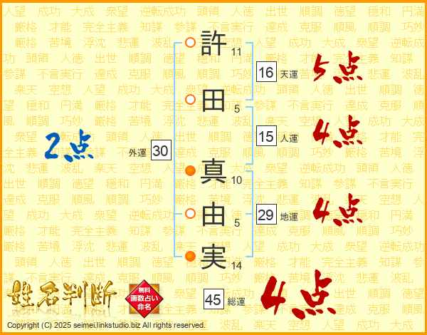 許(11画)田(5画) 真(10画)由(5画)実(14画)