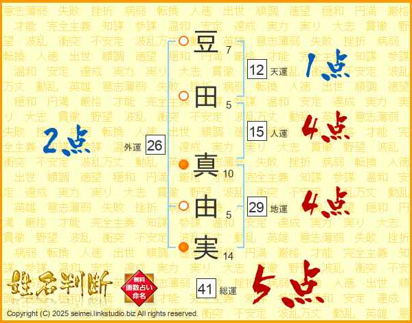 豆(7画)田(5画) 真(10画)由(5画)実(14画)