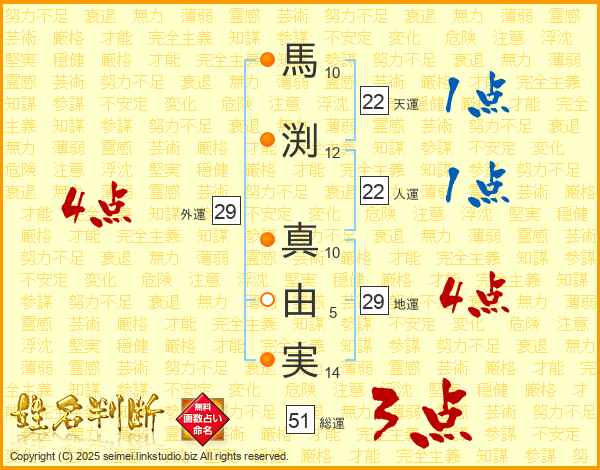 馬(10画)渕(12画) 真(10画)由(5画)実(14画)