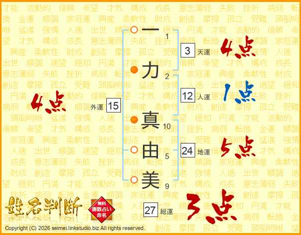 生活面を象徴する運勢です。外部から受ける影響力を表し、結婚運、家庭運や職場、環境への順応性を表します。総運から人運を引いた画数。姓や名が1文字の場合を除く。