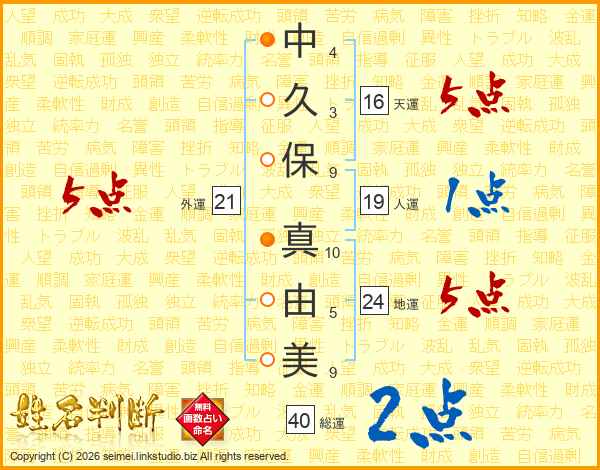 中(4画)久(3画)保(9画) 真(10画)由(5画)美(9画)