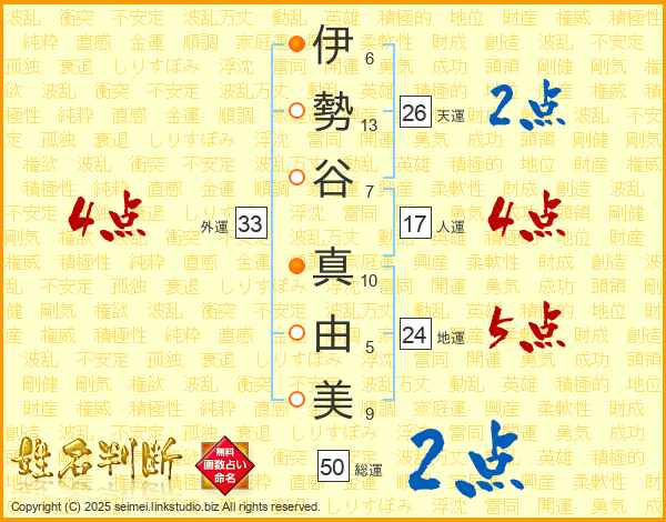 伊(6画)勢(13画)谷(7画) 真(10画)由(5画)美(9画)