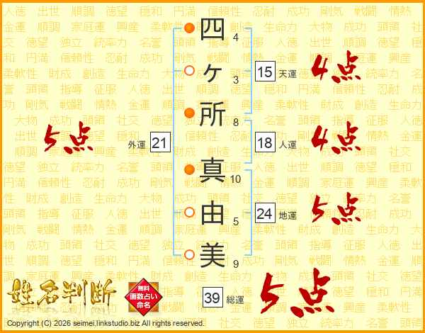 四(4画)ヶ(3画)所(8画) 真(10画)由(5画)美(9画)