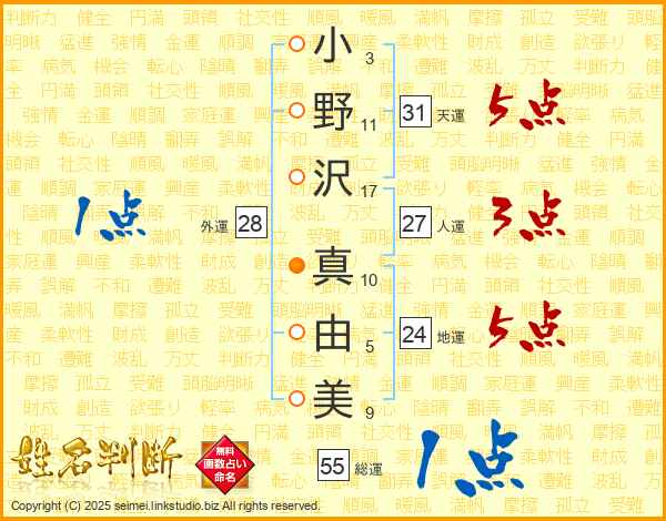 小(3画)野(11画)沢(17画) 真(10画)由(5画)美(9画)