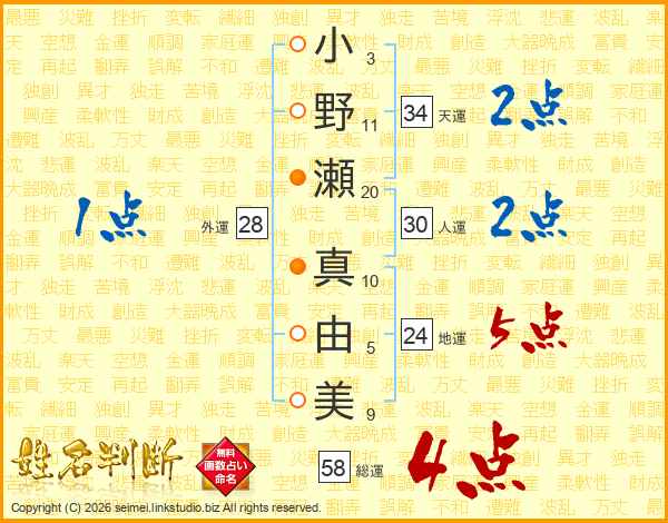 小(3画)野(11画)瀬(20画) 真(10画)由(5画)美(9画)
