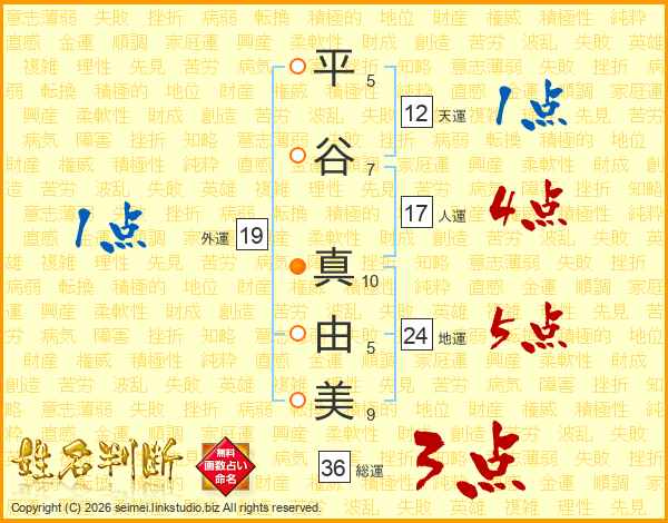 平(5画)谷(7画) 真(10画)由(5画)美(9画)