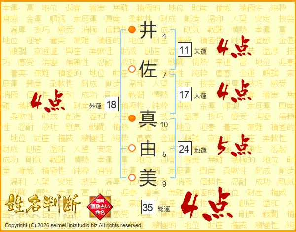 井(4画)佐(7画) 真(10画)由(5画)美(9画)
