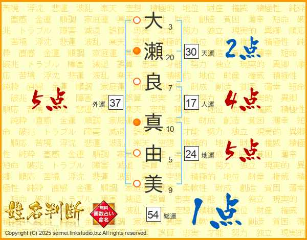 大(3画)瀬(20画)良(7画) 真(10画)由(5画)美(9画)