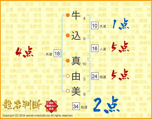牛(4画)込(6画) 真(10画)由(5画)美(9画)