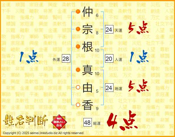 仲(6画)宗(8画)根(10画) 真(10画)由(5画)香(9画)