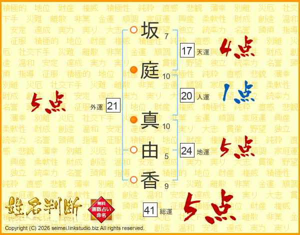 坂庭真由香さんの外運は21画の5点!