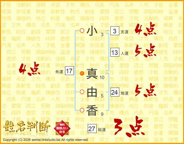 小(3画) 真(10画)由(5画)香(9画)