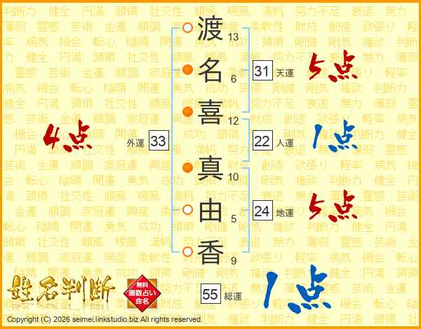 渡(13画)名(6画)喜(12画) 真(10画)由(5画)香(9画)