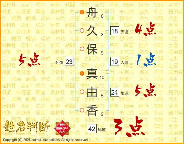 舟(6画)久(3画)保(9画) 真(10画)由(5画)香(9画)