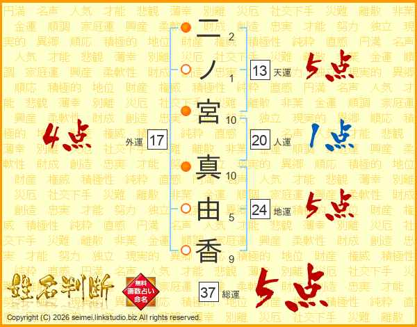 二(2画)ノ(1画)宮(10画) 真(10画)由(5画)香(9画)