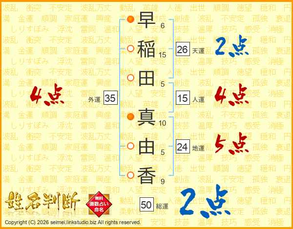 早(6画)稲(15画)田(5画) 真(10画)由(5画)香(9画)