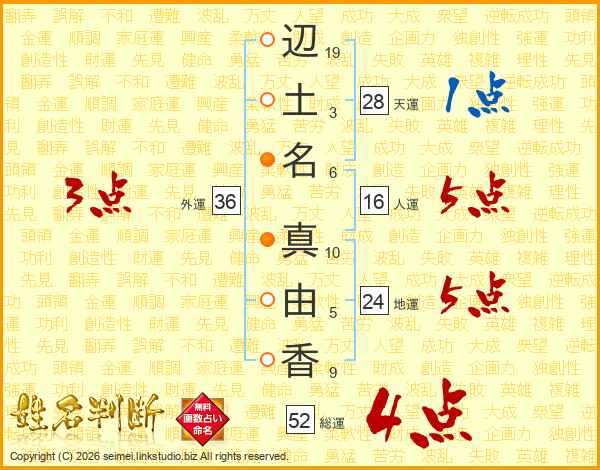 辺(19画)土(3画)名(6画) 真(10画)由(5画)香(9画)