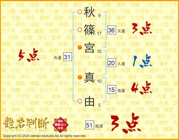 秋(9画)篠(17画)宮(10画) 真(10画)由(5画)