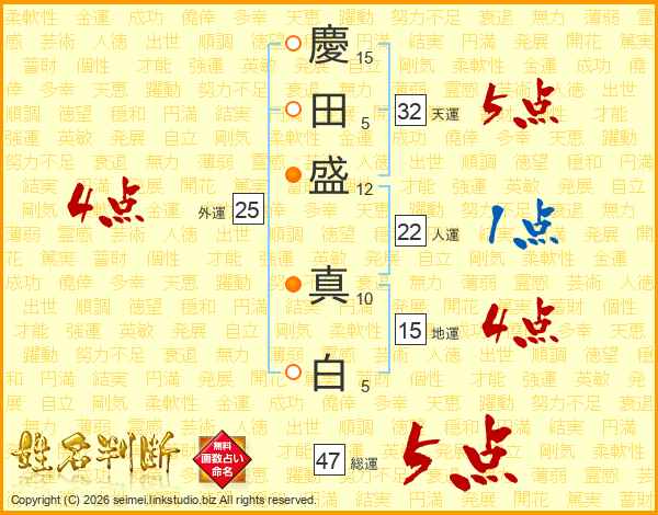 慶(15画)田(5画)盛(12画) 真(10画)白(5画)