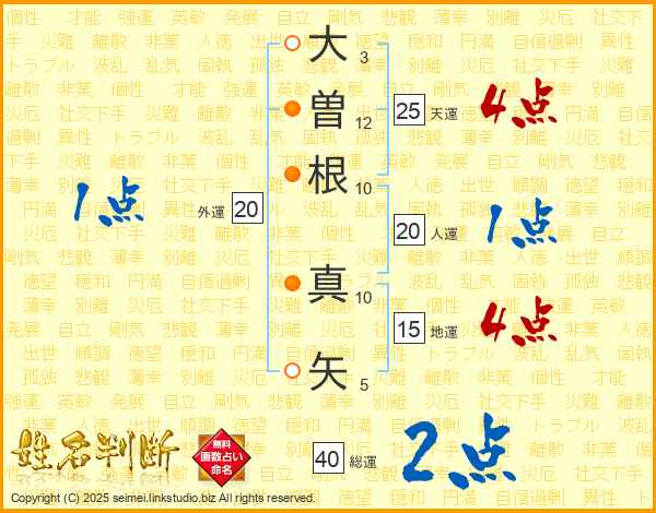 大(3画)曽(12画)根(10画) 真(10画)矢(5画)