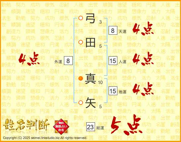 生活面を象徴する運勢です。外部から受ける影響力を表し、結婚運、家庭運や職場、環境への順応性を表します。総運から人運を引いた画数。姓や名が1文字の場合を除く。