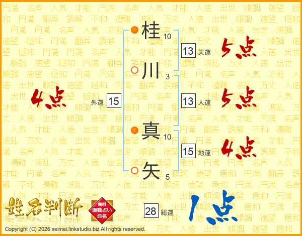 生活面を象徴する運勢です。外部から受ける影響力を表し、結婚運、家庭運や職場、環境への順応性を表します。総運から人運を引いた画数。姓や名が1文字の場合を除く。