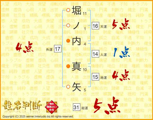 堀(11画)ノ(1画)内(4画) 真(10画)矢(5画)
