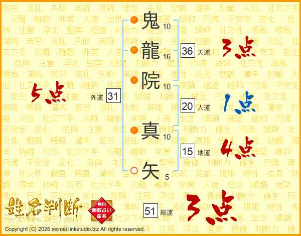 鬼(10画)龍(16画)院(10画) 真(10画)矢(5画)