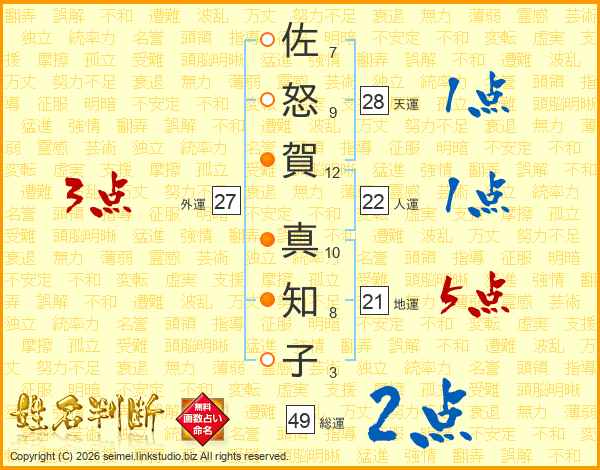 佐(7画)怒(9画)賀(12画) 真(10画)知(8画)子(3画)
