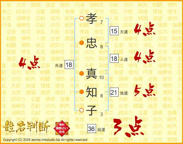孝(7画)忠(8画) 真(10画)知(8画)子(3画)
