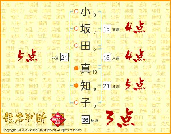 小(3画)坂(7画)田(5画) 真(10画)知(8画)子(3画)