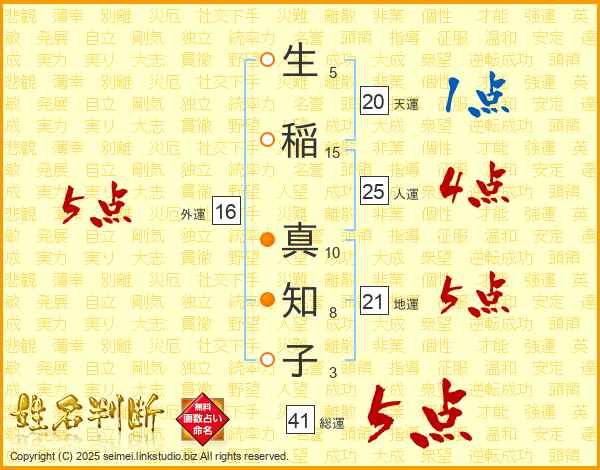 生(5画)稲(15画) 真(10画)知(8画)子(3画)