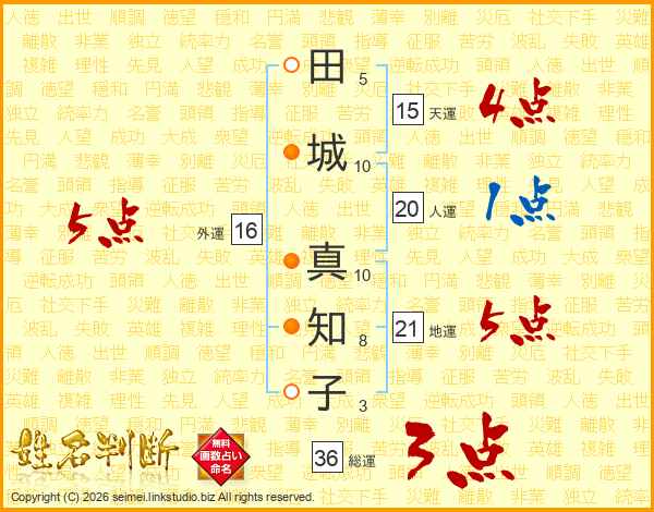 田(5画)城(10画) 真(10画)知(8画)子(3画)
