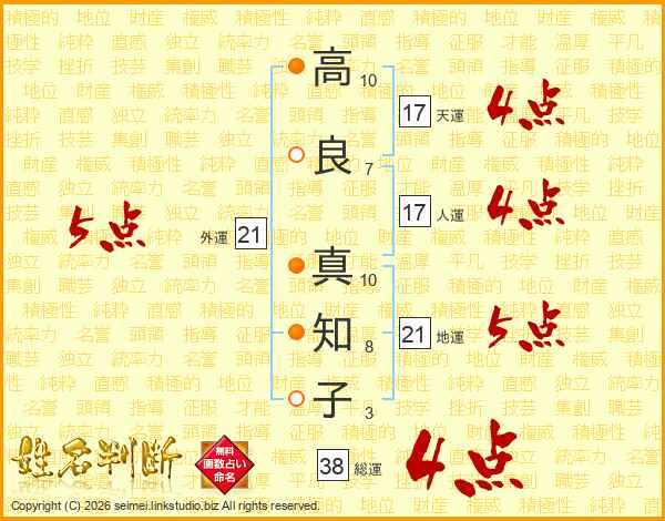 高(10画)良(7画) 真(10画)知(8画)子(3画)