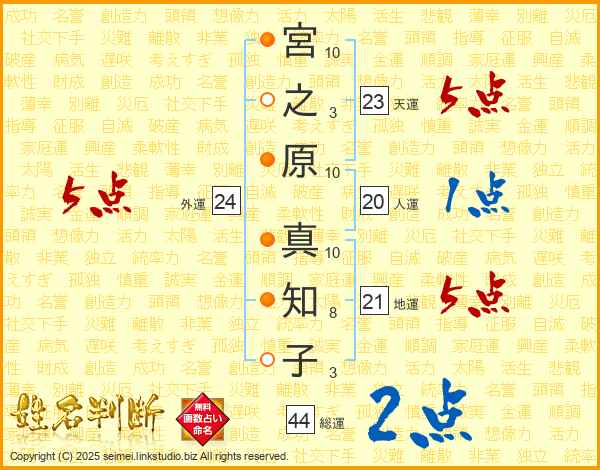 宮(10画)之(3画)原(10画) 真(10画)知(8画)子(3画)