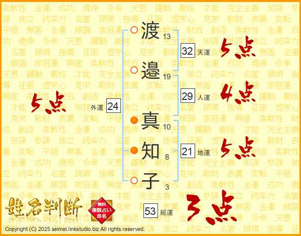 渡(13画)邉(19画) 真(10画)知(8画)子(3画)