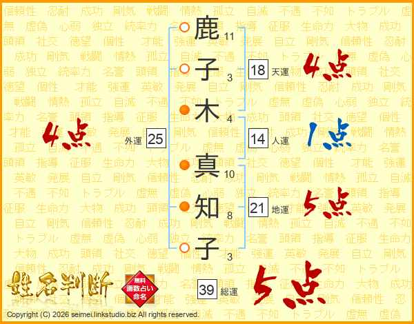 鹿子木真知子さんの総運は39画の5点!
