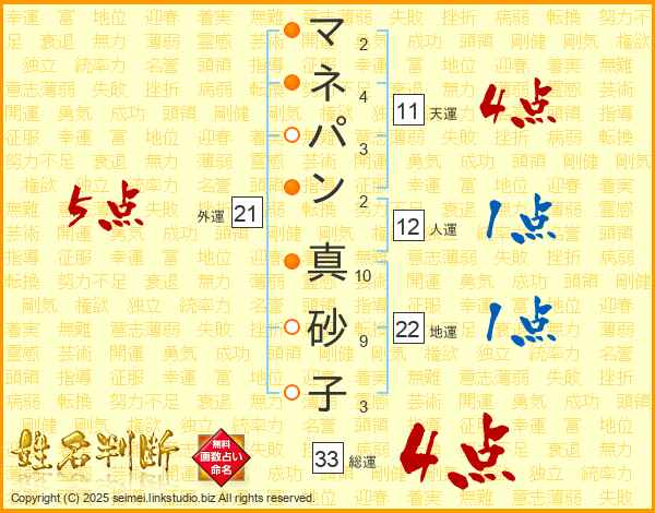 マ(2画)ネ(4画)パ(3画)ン(2画) 真(10画)砂(9画)子(3画)