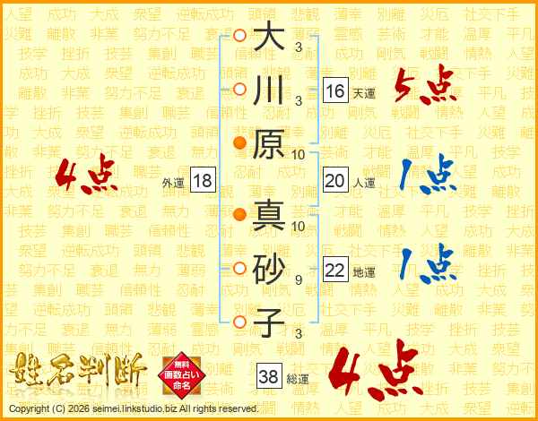 大(3画)川(3画)原(10画) 真(10画)砂(9画)子(3画)
