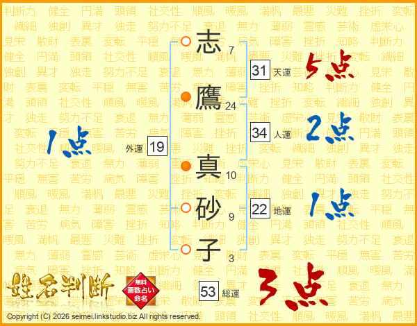 志(7画)鷹(24画) 真(10画)砂(9画)子(3画)