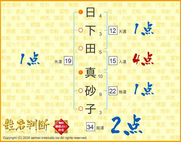 日(4画)下(3画)田(5画) 真(10画)砂(9画)子(3画)