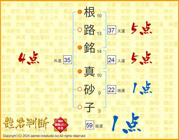 根(10画)路(13画)銘(14画) 真(10画)砂(9画)子(3画)