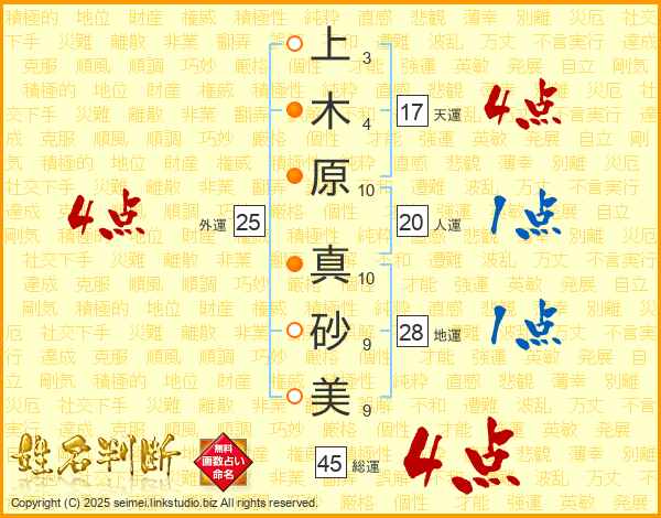 上(3画)木(4画)原(10画) 真(10画)砂(9画)美(9画)