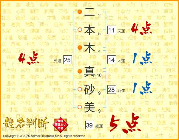 二本木真砂美さんの総運は39画の5点!